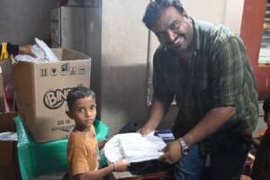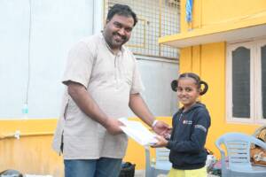 Under the direction of Fr. Anthony Arul, Anand and Arockya visited four Spandana Study Centres, distributing 133 Aarunya English Speaking Workbooks and cream biscuits. The visit inspired children during exams, appreciated volunteers’ dedication, and ended joyfully with Anand’s family joining the meaningful trip.